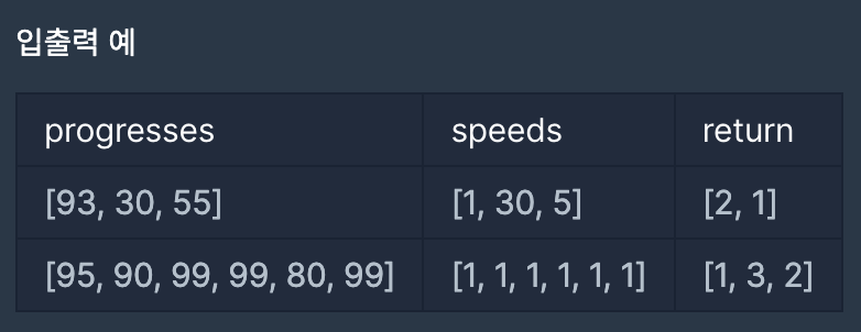 - 작업의 개수(progresses, speeds배열의 길이)는 100개 이하입니다.